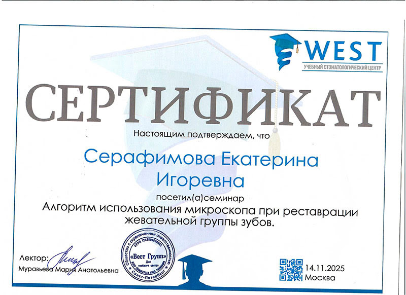 Серафимова Екатерина Игоревна Должность: Врач-стоматолог терапевт. Образование: ММСУ, специальность «Стоматология». В клинике работает с 2005 года. Сертификаты Показать все сертификатыСкрыть