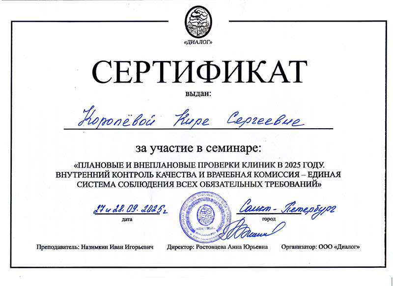 Королева Кира Сергеевна Должность: Врач-стоматолог детского возраста. Сертификаты Показать все сертификатыСкрыть